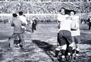 Gol tercipta di partai final antara Argentina dan Uruguay. Nah, uniknya jika kita melihat foto, maka akan menemukan kalau sang kiper memakai memakai topi seperti topi Thomas Shelby ya, apakah dia Peaky Blinders?